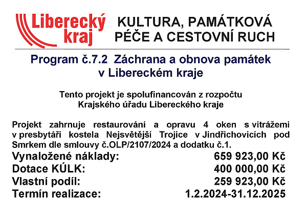 Restaurování a oprava 4 oken s vitrážemi v presbytáři kostela Nejsvětější Trojice v Jindřichovicích pod Smrkem