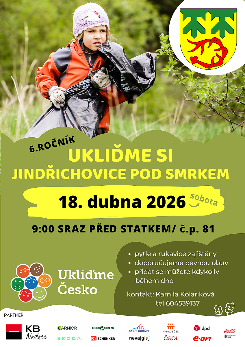 Ukliďme Česko - ukliďme si Jindřichovice pod Smrkem proběhne v sobotu 18. 4. 2026 od 9:00 po celý den a klidně i v neděli.